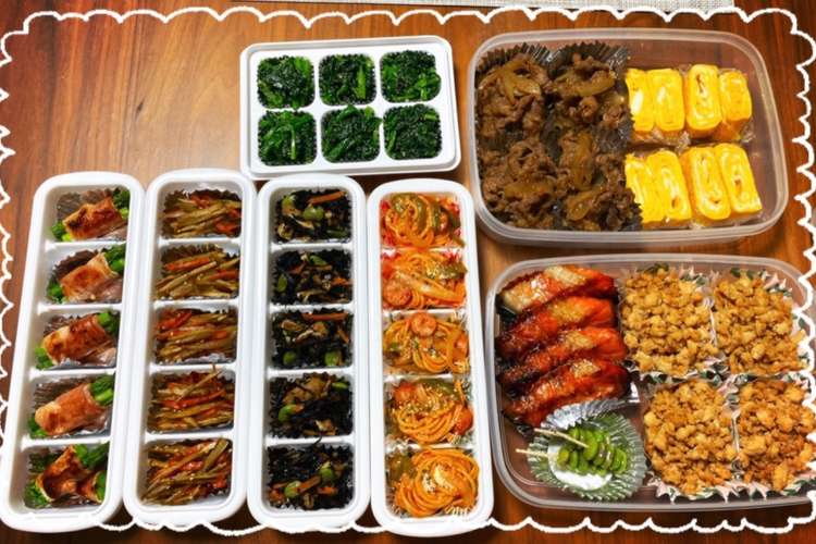 aiouchigohan 出典: instagramcom お弁当の人気メニューとしておすすめしたいのがこのレシピです。 常備菜として冷凍ができるナポリタンを作りましょう。 作り方はニンニクをオリーブオイルで炒めベーコンと玉ねぎ、しめじの順番でさらに炒めます。 ピーマンとゆで汁、コンソメを加えて煮詰め、ケチャップとウスターソース、砂糖とピザ用チーズを加え ゆでて巻くだけ! お弁当のおかずとしても定番人気の肉巻きアスパラは、野菜が一緒にとれて便利。まとめて作って冷凍しておけば常備菜としても活用できます。 材料 (個分) 豚薄切り肉 枚 アスパラガス 本 塩 少々 片栗粉 適量 サラダ油 適量作り置き・冷凍できるおかずのレシピ・作り方の人気ランキングを無料で大公開! 簡単! 作り置きおかず! レンコンのにんにく炒め レンコン、にんにく、白ごま、オリーブオイル、岩塩、醤油 by toytoy*saori05 香ばしい♪ 焼きおにぎり☆ 冷凍ご飯でも! ご飯 (冷凍ご飯、冷ご飯でも)、鰹節 (約5g)、いりゴマ、〇醤油、/、みりん、/、ゴマ油 by こぶた *子ども